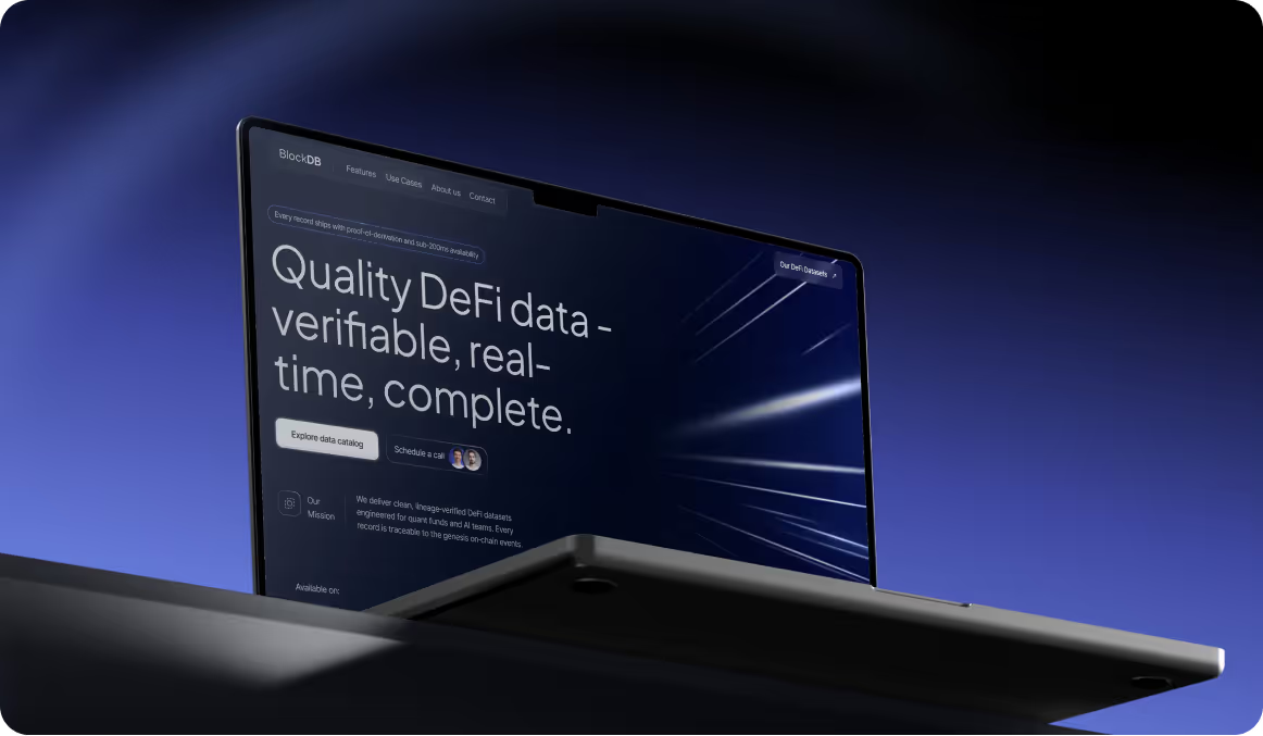 BlockDB is a DeFi data infrastructure provider serving quant funds, banks, and AI teams. Arounda redesigned the corporate landing page to clarify lineage-verified datasets, strengthen enterprise positioning, and increase qualified B2B inquiries.